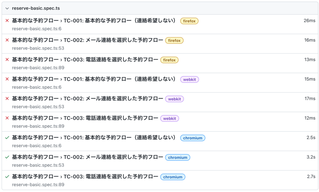 実行レポートを見たらどうやらfirefoxとwebkitのみ失敗しているようです。